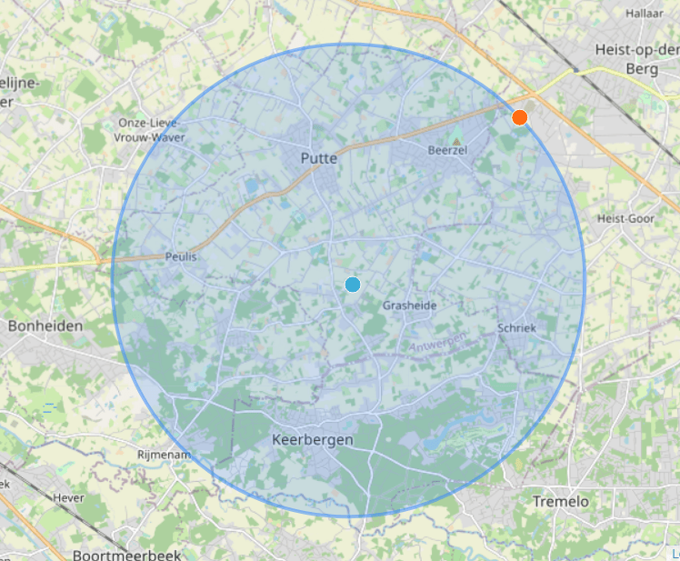 - de kilometervergoeding (€1,5/km heen en terug, rekenend vanaf Kaaslei 4, 2580 Putte) Binnen de blauwe cirkel is het gratis!!!